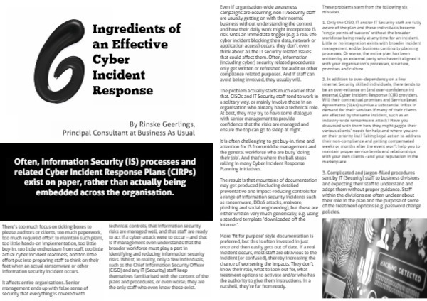 The result is that mountains of documentation may get produced (including detailed preventative and impact-reducing controls for a range of information security incidents such as ransomware, DDoS attacks, malware, phishing and social engineering), but these are either written very much generically, e.g. using a standard template ‘downloaded off the Internet’.