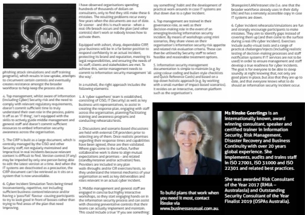Ms Rinske Geerlings is an internationally known, award winning consultant, speaker and certified trainer in Information Security, Risk Management, Disaster Recovery and Business Continuity with over 20 years global experience. She implements, audits and trains staff in ISO 27001, ISO