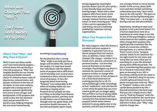 Importantly, needing to reset your purpose is not a personal failure; it’s a human experience most of us experience at some stage in our life. As one of the psychologists I read an article from on this explains, people often change their purpose after significant life transitions like the death of a loved one, children leaving home, or a serious illness. There’s even a term, “purpose anxiety" (mark in the sand here for me right now!), for the stress and worry that can arise when you’re searching for a new life direction during these difficult periods. The key is remembering that purpose can be re-found or reinvented. What gave us meaning in our 20's is extremely unlikely to be the same in our 50's. And that’s okay! In my case, a health upheaval forced me to pause and question what my "Why" or "Purpose" really is now, at this upside down period in my life. I learned (sometimes the hard way) that you can’t simply check a box next to “Find my Purpose” and it be solved and sorted for the res