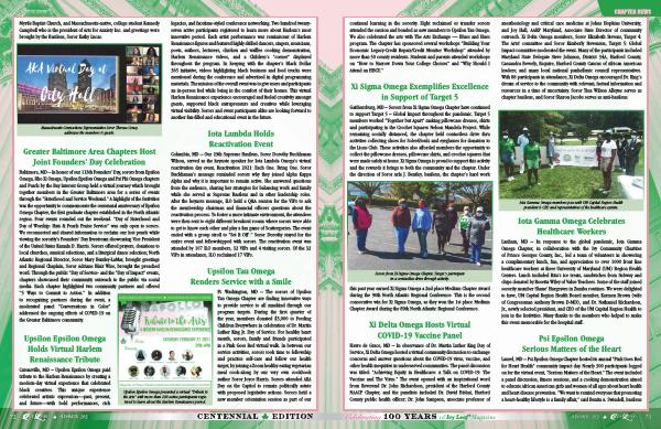 Baltimore , MD – In honor of our 113th Founders ' Day , sorors from Epsilon Omega , Rho Xi Omega , Upsilon Epsilon Omega and Psi Phi Omega chapters and Pearls by the Bay Interest Group held a virtual journey which brought together members in the Greater Baltimore area for a series of events through the " Sisterhood and Service Weekend ." A highlight of the festivities was the opportunity to commemorate the centennial anniversary of Epsilon Omega Chapter , the first graduate chapter established in the North Atlantic region . Four events rounded out the weekend . “ Day of Sisterhood and Day of Worship : Hats & Pearls Praise Service ” was only open to sorors . We reconnected and shared information to reclaim our lost pearls while viewing the sorority ' s Founders ’ Day livestream showcasing Vice President of the United States Kamala D . Harris . Sorors offered prayers , donations to local churches , musical selections , and a liturgical dance selection ; North Atlantic Regional Director , Soror Mary Bentley-LaMar , brought greetings and Regional Chaplain , Soror Adriane Blair Wise , brought the preached word . Through the public " Day of Service- and the " Day of Impact " events , chapters showcased their community outreach to the public via social media . Each chapter highlighted two community partners and offered “ 5 Ways to Commit to Action .” In addition to recognizing partners during the event , a moderated panel " Conversations in Color " addressed the ongoing effects of COVID-19 on the Greater Baltimore community .