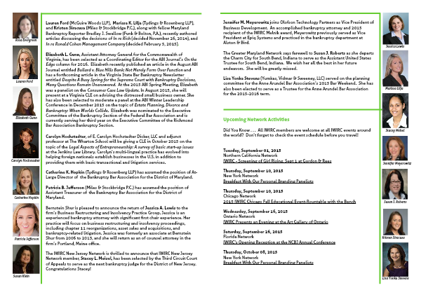 Lauren Ford (McGuire Woods LLP), Marissa K. Lilja (Tydings & Rosenberg LLP), and Kristen Siracusa (Miles & Stockbridge P.C.), along with fellow Maryland Bankruptcy Reporter Bradley J. Swallow (Funk & Bolton, P.A.), recently authored articles discussing the decisions of In re Rich (decided November 26, 2014), and In re Ronald Cohen Management Company (decided February 5, 2015).