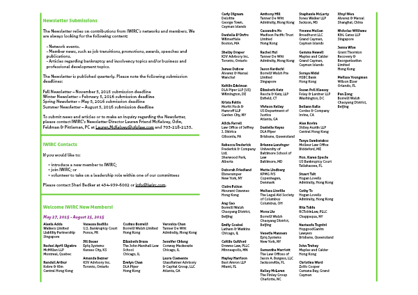 To submit news and articles or to make an inquiry regarding the Newsletter, please contact IWIRC's Newsletter Director Lauren Friend McKelvey, Odin, Feldman & Pittleman, PC at Lauren.McKelvey@ofplaw.com and 703-218-2135.