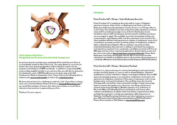 As we have done the last few years, we kicked off the 2016 Sponsor Drive at our Leadership Summit in New York in July. Our many thanks go out to the 24 leaders who have already pledged firm and/or individual support for the programs and initiatives of IWIRC worldwide. In addition to supporting IWIRC and providing tangible benefits to you and your firm, you will also be entered in the drawing for a pair of BOSE headphones to be given away at the Fall Conference in Miami in September, 2015. Please click on the following links to reference the sponsorship benefits as well as the commitment form.