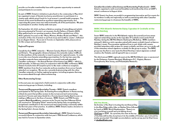 IWIRC Ontario has been successful in programming innovative and fun events for its members locally and regionally as well as partnering with other Canadian restructuring groups to showcase the benefits of IWIRC.