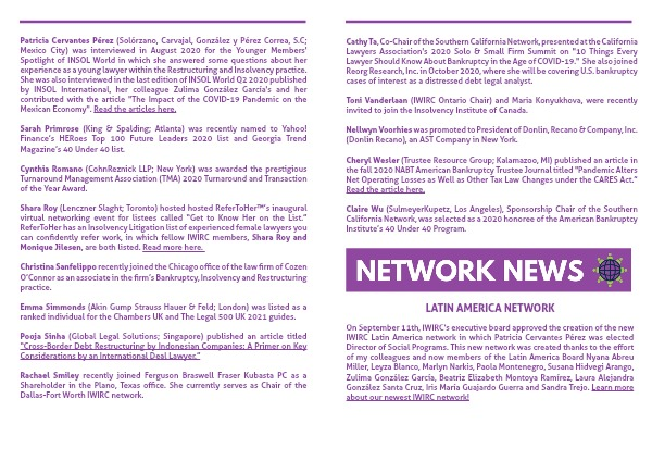 Patricia Cervantes Pérez (Solórzano, Carvajal, González y Pérez Correa, S.C; Mexico City) was interviewed in August 2020 for the Younger Members' Spotlight of INSOL World in which she answered some questions about her experience as a young lawyer within the Restructuring and Insolvency practice. She was also interviewed in the last edition of INSOL World Q2 2020 published by INSOL International, her colleague Zulima González García's and her contributed with the article "The Impact of the COVID-19 Pandemic on the Mexican Economy". Read the articles here.