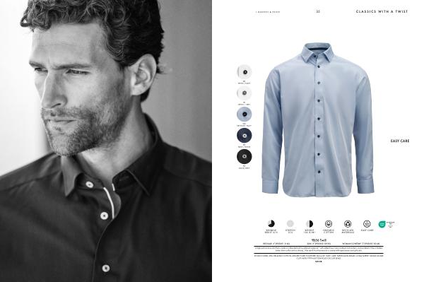 SOLID COLORS. 60 % ORGANIC COTTON, 40 % RECYCLED POLYESTER. 134 G / M 2. EASY CARE. TAPED MAIN SEAMS. LONG SLEEVE. SINGLE ANGLE CUFF, WITH EXTRA BUTTONHOLE FOR CUFFLINKS. 549 KR.