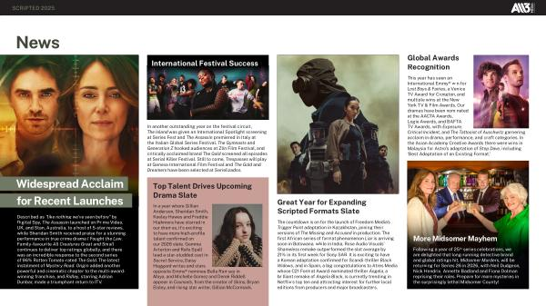 This year has seen an International Emmy ® win for Lost Boys & Fairies, a Venice TV Award for Crongton, and multiple wins at the New York TV & Film Awards. Our dramas have been nominated at the AACTA Awards, Logie Awards, and BAFTA TV Awards, with Exposure, Critical Incident, and The Tattooist of Auschwitz garnering acclaim in drama, performance, and craft categories. In the Asian Academy Creative Awards there were wins in Malaysia for Astro’ s adaptation of Step Dave, including‘ Best Adaptation of an Existing Format.’ |