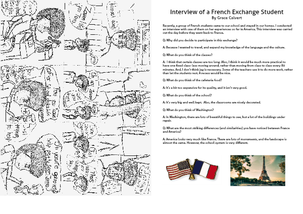 Recently, a group of French students came to our school and stayed in our homes. I conducted an interview with one of them on her experiences so far in America. This interview was carried out the day before they went back to France.