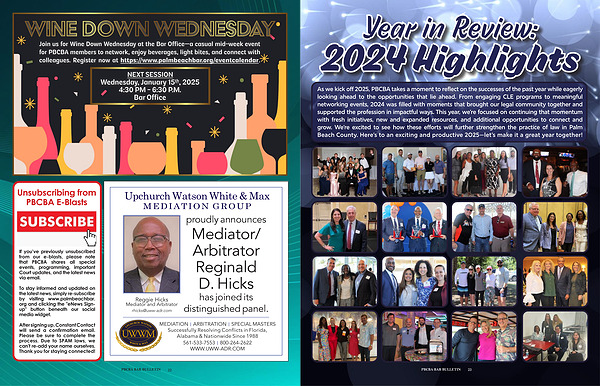 As we kick off 2025 , PBCBA takes a moment to reflect on the successes of the past year while eagerly looking ahead to the opportunities that lie ahead . From engaging CLE programs to meaningful networking events , 2024 was filled with moments that brought our legal community together and supported the profession in impactful ways . This year , we ’ re focused on continuing that momentum with fresh initiatives , new and expanded resources , and additional opportunities to connect and grow . We ’ re excited to see how these efforts will further strengthen the practice of law in Palm Beach County . Here ’ s to an exciting and productive 2025 — let ’ s make it a great year together !
