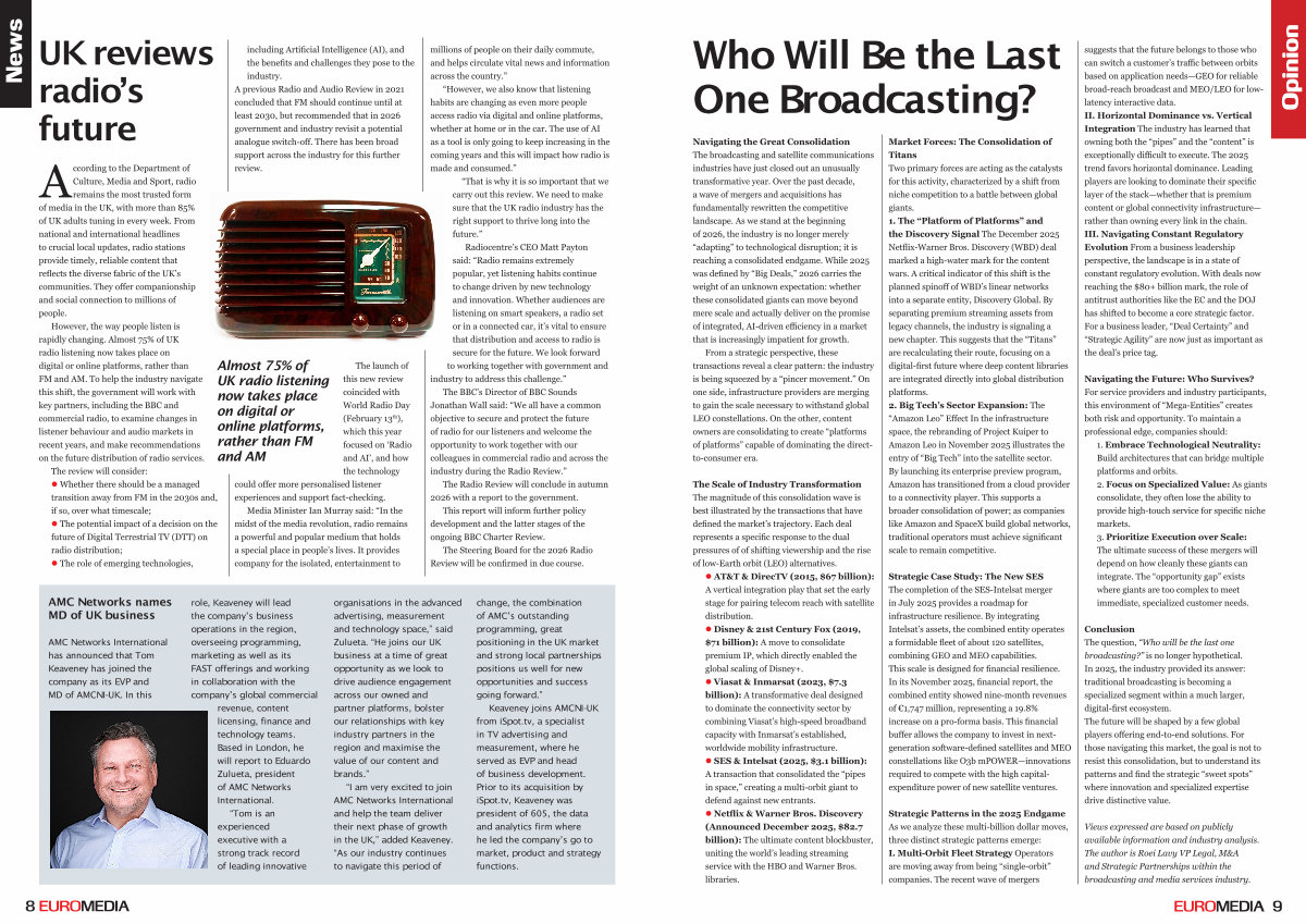 Navigating the Great Consolidation Market Forces: The Consolidation of The broadcasting and satellite communications Titans industries have just closed out an unusually Two primary forces are acting as the catalysts transformative year. Over the past decade, for this activity, characterized by a shift from a wave of mergers and acquisitions has niche competition to a battle between global fundamentally rewritten the competitive giants. landscape. As we stand at the beginning 1. The“ Platform of Platforms” and of 2026, the industry is no longer merely the Discovery Signal The December 2025“ adapting” to technological disruption; it is Netflix-Warner Bros. Discovery( WBD) deal reaching a consolidated endgame. While 2025 marked a high-water mark for the content was defined by“ Big Deals,” 2026 carries the wars. A critical indicator of this shift is the weight of an unknown expectation: whether planned spinoff of WBD’ s linear networks these consolidated giants can move beyond into a separate entity, Discovery Global. By mere scale and actually deliver on the promise separating premium streaming assets from of integrated, AI-driven efficiency in a market legacy channels, the industry is signaling a that is increasingly impatient for growth. new chapter. This suggests that the“ Titans”