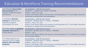 City Facilitator - CMO & City Council Timeframe – Long term ( 3-5 years ) - PENDING Partners – ISD ’ s , TCC , UTA Actions : Chief Equity Officer will convene a working group of K-12 and higher education institutions to explore this recommendation .