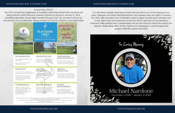 Annual Pass ( 2023 ): The 2023 Annual Pass Application is available . Returning Annual Pass members are being offered a $ 200 discount renewal incentive to renew by January 15 , 2023 . Benefitted Members ( those billed monthly through HOA ) do not need to fill out an Annual Pass form or otherwise . Please contact the Golf Pro Shop for more information .