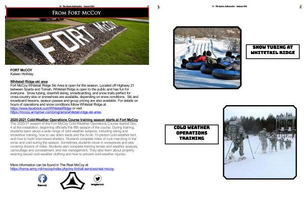 2020-2021 Cold-Weather Operations Course training season starts at Fort McCoy The 2020-21 season of the Fort McCoy Cold-Weather Operations Course started Dec . 4 at the installation , beginning officially the fifth season of the course . During training , students learn about a wide range of cold-weather subjects , including skiing and snowshoe training , how to use ahkio sleds and the Arctic 10-person cold-weather tent , and how to build improvised shelters . Students complete miles of ruck marching in the snow and cold during the season . Sometimes students move in snowshoes and skis covering dozens of miles . Students also complete training terrain and weather analysis , camouflage and concealment , and risk management . They also learn about properly wearing issued cold-weather clothing and how to prevent cold-weather injuries .