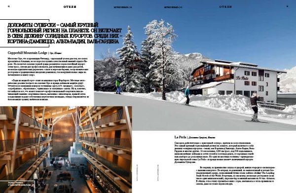 Ски здесь действительно с приставкой « супер », причем во всех отношениях . Это самый крупный горнолыжный регион на планете , который включает в себя дюжину солидных курортов – таких , как Кортина-д ’ Ампеццо , Альта-Бадия , Валь- Гардена и многие другие . 16 зон катания , 1200 км трасс , под 500 подъемников , живописнейшие пейзажи и сотни отелей и гостевых домов , от скромных семейных альберго до роскошных шале . Но одну из местных гостиниц – принадлежащую тирольской семье La Perla – и правда можно назвать жемчужиной курорта Доломиты Суперски .