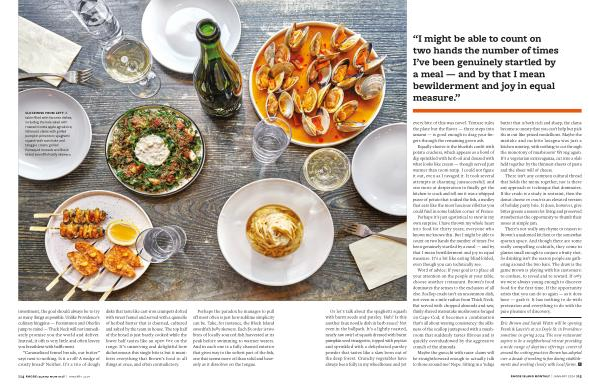 “ Caramelized fennel breads , our butter ” says next to nothing . Is it a roll ? A wedge of crusty bread ? Neither . It ’ s a trio of dough disks that taste like cast-iron crumpets dotted with sweet fennel and served with a quenelle of herbed butter that is churned , cultured and salted by the team in house . The top half of the bread is just barely cooked while the lower half tastes like an open fire on the range . It ’ s unnerving and delightful how dichotomous this single bite is but it manifests everything that Brown ’ s food is : all things at once , and often contradictory .