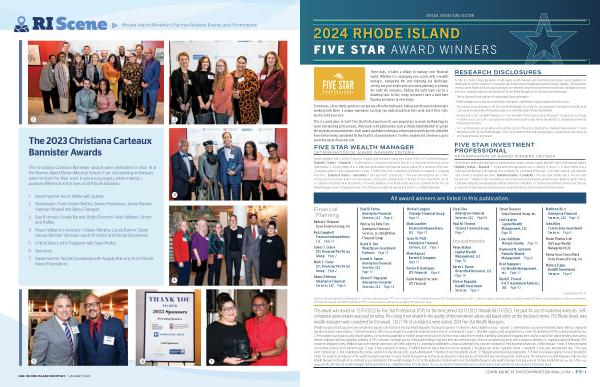 Wealth managers do not pay a fee to be considered or placed on the final list of Five Star Wealth Managers . The award is based on 10 objective criteria . Eligibility criteria – required : 1 . Credentialed as a registered investment adviser ( RIA ) or a registered investment adviser representative ; 2 . Actively licensed as a RIA or as a principal of a registered investment adviser firm for a minimum of 5 years ; 3 . Favorable regulatory and complaint history review ( As defined by FSP , the wealth manager has not ; A . Been subject to a regulatory action that resulted in a license being suspended or revoked , or payment of a fine ; B . Had more than a total of three settled or pending complaints filed against them and / or a total of five settled , pending , dismissed or denied complaints with any regulatory authority or FSP ’ s consumer complaint process . Unfavorable feedback may have been discovered through a check of complaints registered with a regulatory authority or complaints registered through FSP ’ s consumer complaint process ; feedback may not be representative of any one client ’ s experience ; C . Individually contributed to a financial settlement of a customer complaint ; D . Filed for personal bankruptcy within the past 11 years ; E . Been terminated from a financial services firm within the past 11 years ; F . Been convicted of a felony ); 4 . Fulfilled their firm review based on internal standards ; 5 . Accepting new clients . Evaluation criteria – considered : 6 . One-year client retention rate ; 7 . Five-year client retention rate ; 8 . Non-institutional discretionary and / or non-discretionary client assets administered ; 9 . Number of client households served ; 10 . Education and professional designations . FSP does not evaluate quality of services provided to clients . The award is not indicative of the wealth manager ’ s future performance . Wealth managers may or may not use discretion in their practice and therefore may not manage their clients ’ assets . The inclusion of a wealth manager on the Five Star Wealth Manager list should not be construed as an endorsement of the wealth manager by FSP or this publication . Working with a Five Star Wealth Manager or any wealth manager is no guarantee as to future investment success , nor is there any guarantee that the selected wealth managers will be awarded this accomplishment by FSP in the future . This year , we honored 3 Rhode Island-area investment professionals with the Five Star Investment Professional award .
