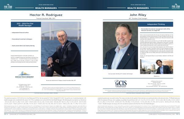 registered investment adviser representative ; 2 . Actively licensed as a RIA or as a principal of a registered investment adviser firm for a minimum of 5 years ; 3 . Favorable regulatory and complaint history review ( As defined by FSP , the wealth pending , dismissed or denied complaints with any regulatory authority or FSP ’ s consumer complaint process . Unfavorable feedback may have been discovered through a check of complaints registered with a regulatory authority or complaints past 11 years ; E . Been terminated from a financial services firm within the past 11 years ; F . Been convicted of a felony ); 4 . Fulfilled their firm review based on internal standards ; 5 . Accepting new clients . Evaluation criteria – considered : 6 . One-year evaluate quality of services provided to clients . The award is not indicative of the wealth manager ’ s future performance . Wealth managers may or may not use discretion in their practice and therefore may not manage their clients ’ assets . The as to future investment success , nor is there any guarantee that the selected wealth managers will be awarded this accomplishment by FSP in the future . Visit www . fivestarprofessional . com .