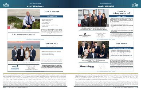 registered investment adviser representative ; 2 . Actively licensed as a RIA or as a principal of a registered investment adviser firm for a minimum of 5 years ; 3 . Favorable regulatory and complaint history review ( As defined by FSP , the wealth pending , dismissed or denied complaints with any regulatory authority or FSP ’ s consumer complaint process . Unfavorable feedback may have been discovered through a check of complaints registered with a regulatory authority or complaints past 11 years ; E . Been terminated from a financial services firm within the past 11 years ; F . Been convicted of a felony ); 4 . Fulfilled their firm review based on internal standards ; 5 . Accepting new clients . Evaluation criteria – considered : 6 . One-year evaluate quality of services provided to clients . The award is not indicative of the wealth manager ’ s future performance . Wealth managers may or may not use discretion in their practice and therefore may not manage their clients ’ assets . The as to future investment success , nor is there any guarantee that the selected wealth managers will be awarded this accomplishment by FSP in the future . Visit www . fivestarprofessional . com .
