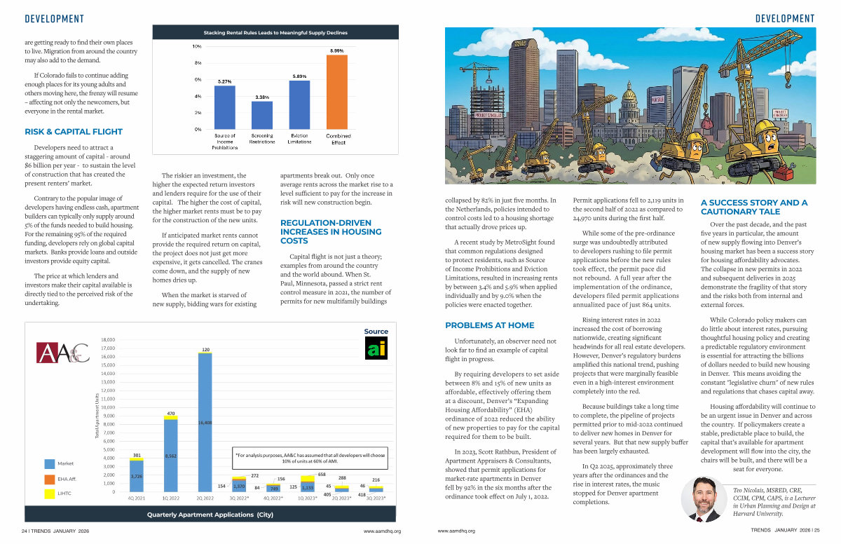 The riskier an investment, the higher the expected return investors and lenders require for the use of their capital. The higher the cost of capital, the higher market rents must be to pay for the construction of the new units.