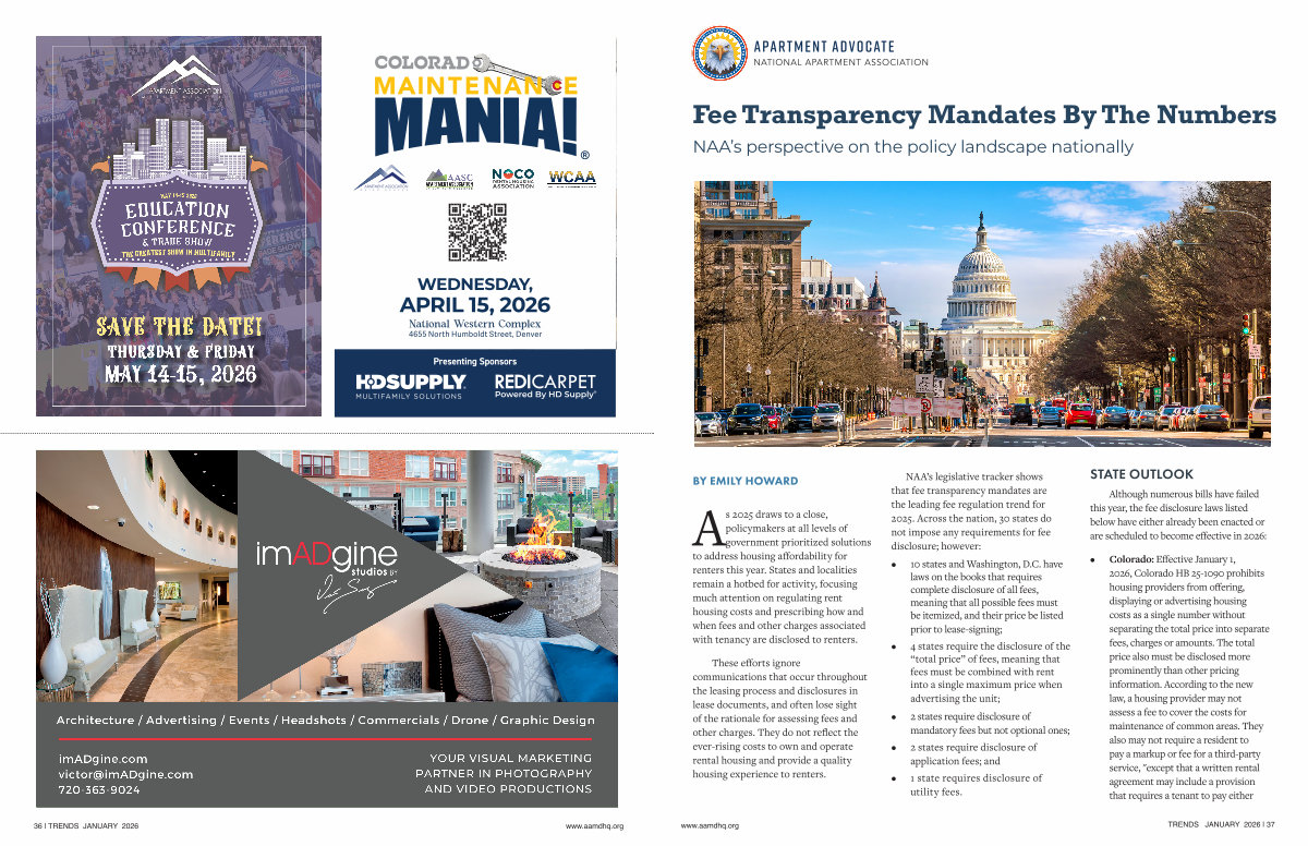 • Colorado: Effective January 1, 2026, Colorado HB 25-1090 prohibits housing providers from offering, displaying or advertising housing costs as a single number without separating the total price into separate fees, charges or amounts. The total price also must be disclosed more prominently than other pricing information. According to the new law, a housing provider may not assess a fee to cover the costs for maintenance of common areas. They also may not require a resident to pay a markup or fee for a third-party service, " except that a written rental agreement may include a provision that requires a tenant to pay either www. aamdhq. org TRENDS JANUARY 2026 | 37