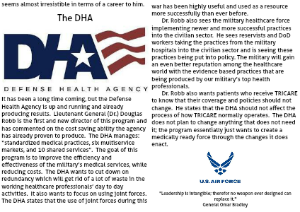 It has been a long time coming, but the Defense Health Agency is up and running and already producing results. Lieutenant General (Dr.) Douglas Robb is the first and new director of this program and has commented on the cost saving ability the agency has already proven to produce. The DHA manages: “standardized medical practices, six multiservice markets, and 10 shared services”. The goal of this program is to improve the efficiency and effectiveness of the military’s medical services, while reducing costs. The DHA wants to cut down on redundancy which will get rid of a lot of waste in the working healthcare professionals’ day to day activities. It also wants to focus on using joint forces. The DHA states that the use of joint forces during this war has been highly useful and used as a resource more successfully than ever before.