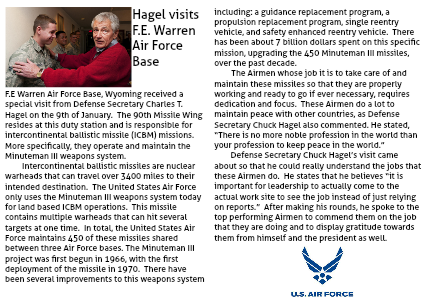 F.E Warren Air Force Base, Wyoming received a special visit from Defense Secretary Charles T. Hagel on the 9th of January. The 90th Missile Wing resides at this duty station and is responsible for intercontinental ballistic missile (ICBM) missions. More specifically, they operate and maintain the Minuteman III weapons system.