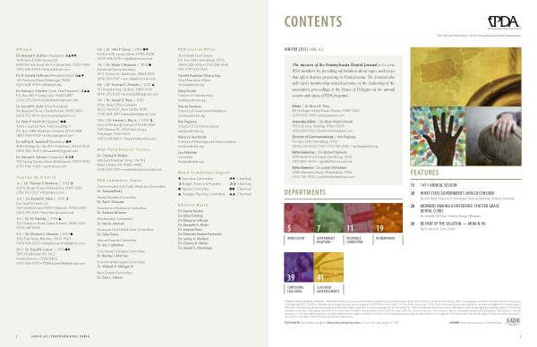 The mission of the Pennsylvania Dental Journal is to serve PDA members by providing information about topics and issues that affect dentists practicing in Pennsylvania . The Journal also will report membership-related activities of the leadership of the association , proceedings of the House of Delegates at the annual session and status of PDA programs .