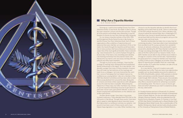 For me , being a tripartite member of the ADA , PDA and Montgomery Bucks Dental Society is like being in a real life Choose Your Own Adventure book . Each of these organizations offers a plethora of opportunities and resources that every member can customize to fit his or her needs . My travels through the tripartite world have taken me on many journeys that have enhanced my professional career . One of the most significant benefits I have is networking . I was introduced to my current employer through my local society . It has been a very rewarding associateship . I am learning immensely from the practice owner , who has become my mentor , and I also enjoy working with the patients and office team members .