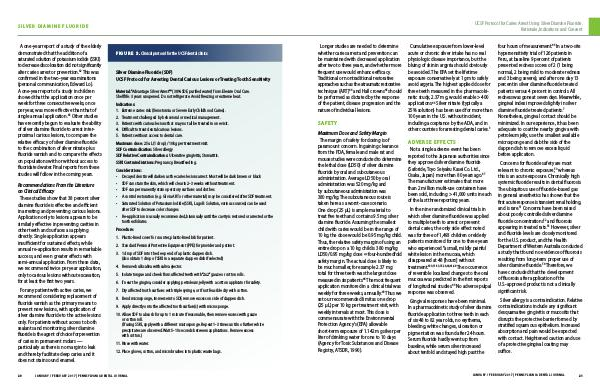 Gingival responses have been minimal. In a pharmacokinetic study of silver diamine fluoride application to three teeth in each of six 48 to 82 year olds, no erythema, bleeding, white changes, ulceration or pigmentation was found after 24 hours. Serum fluoride hardly went up from baseline, while serum silver increased about tenfold and stayed high past the four hours of measurement. 46 In a two-site hypersensitivity trial of 126 patients in Peru, at baseline 9 percent of patients presented redness scores of 2( 1 being normal, 2 being mild to moderate redness and 3 being severe); and after one day 13 percent in silver diamine fluoride treated patients versus 4 percent in controls. All redness was gone at seven days. Meanwhile, gingival index improved slightly in silver diamine fluoride treated patients. 7 Nonetheless, gingival contact should be minimized. In our experience, it has been adequate to coat the nearby gingiva with petroleum jelly, use the smallest available microsponge and dab the side of the dappen dish to remove excess liquid before application.