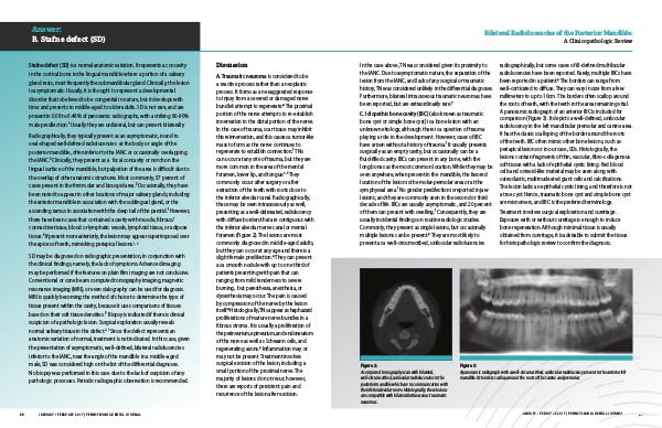 C. Idiopathic bone cavity( IBC)( also known as traumatic bone cyst or simple bone cyst) is a bone lesion with an unknown etiology, although there is a question of trauma playing a role in the development. However, cases of IBC have arisen without a history of trauma. 1 It usually presents surgically as an empty cavity, but occasionally can be a fluid-filled cavity. IBCs can present in any bone, with the long bones as the most common location. While they may be seen anywhere, when present in the mandible, the favored location of the lesion is the molar-premolar area or at the symphyseal area. 1 No gender predilection is reported in jaw lesions, and they are commonly seen in the second or third decade of life. IBCs are usually asymptomatic, and 20 percent of them can present with swelling. 1 Consequently, they are usually incidental findings on routine radiologic studies. Commonly, they present as single lesions, but occasionally multiple lesions can be present. 8 They are most likely to present as a well-circumscribed, unilocular radiolucencies radiographically, but some cases of ill-defined multilocular radiolucencies have been reported. Rarely, multiple IBCs have been reported in a patient. 9 The borders can range from well-corticated to diffuse. They can vary in size from a few millimeters to up to 10cm. The borders often scallop around the roots of teeth, with the teeth in the area remaining vital. A panoramic radiograph of an anterior IBC is included for comparison( Figure 3). It depicts a well-defined, unilocular radiolucency in the left mandibular premolar and canine area. It has the classic scalloping of the border around the roots of the teeth. IBC often mimic other bone lesions, such as periapical lesions or in our case, SDs. Histologically, the lesions contain fragments of thin, vascular, fibro-collagenous soft tissue with a lack of epithelial cystic lining. Red blood cells and osteoid-like material may be seen along with osteoclastic, multinucleated giant cells and calcifications. The lesion lacks an epithelial cystic lining, and therefore is not a true cyst. Hence, traumatic bone cyst and simple bone cyst are misnomers, and IBC is the preferred terminology.