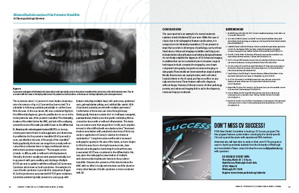 D. Keratocystic odontogenic tumor( KCOT) is a benign, odontogenic lesion that is locally-aggressive and destructive. A predilection for the posterior mandible( 65-83 percent) is seen, specifically in the area of the angle of the mandible. 1 Radiographically, the lesion can range from a small, well-circumscribed, unilocular lesion to large, multilocular lesions with anterio-posterior expansion. 10 The margins can be sclerotic or diffuse, with or without tooth displacement. Clinically, the lesion usually presents asymptomatically, but may present with pain, swelling and discharge. Multiple KCOTs are seen in patients with Nevoid Basal Cell Carcinoma Syndrome also known as Gorlin syndrome. An example of a case of Gorlin syndrome is provided for comparison( Figure 4). Gorlin syndrome is associated with PTCH gene mutations. Syndromic patients typically present at a young age with features including multiple basal cell carcinomas, epidermal cysts, palmar / plantar pitting, and calcified falx cerebri. 90 % of syndromic patients present with multiple jaw lesions. 1 Confirmation of the lesions are done through biopsy. Histologically, the lesion consists of a 5 to 8 cell layer, corrugated, parakeratinized, friable cystic lining with underlying fibrous connective tissue with or without inflammation. This lesion has a recurrence rate that ranges from 5-62 %, and complete removal is often difficult with enucleation alone. 1 Treatment involves enucleation with peripheral ostectomy of the bony cavity or application of Carnoy’ s solution for chemical cauterization. 11 Complete excision will result in increased radiographic opacity in the area of the lesion, as bone begins to fill in the area. Due to the high recurrence rate, close clinical and radiographic monitoring for at least five years is warranted. KCOT was considered in the differential in this case given the radiographic presentation of multiple well-circumscribed radiolucent lesions in the posterior mandible. However, the presence of the lesions below the IANC with no effect on adjacent structures and the absence of any other features of Gorlin syndrome is more consistent with SD.