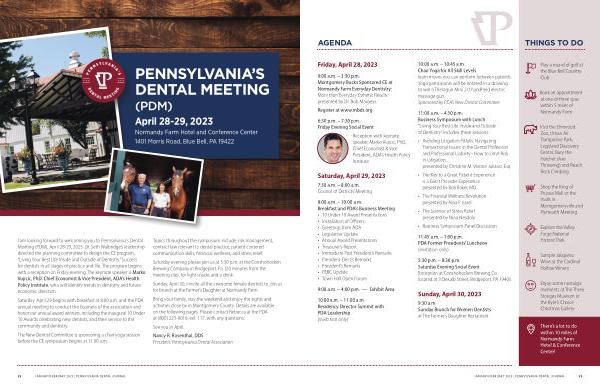I am looking forward to welcoming you to Pennsylvania ’ s Dental Meeting ( PDM ), April 28-29 , 2023 . Dr . Seth Walbridge ’ s leadership directed the planning committee to design the CE program , “ Living Your Best Life Inside and Outside of Dentistry .” Success for dentists in all stages of practice and life . The program begins with a reception on Friday evening . The keynote speaker is Marko Vujicic , PhD , Chief Economist & Vice President , ADA ’ s Health Policy Institute , who will identify trends in dentistry and future economic direction .