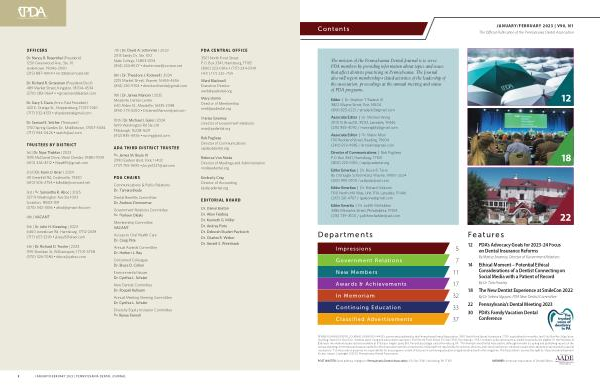 PENNSYLVANIA DENTAL JOURNAL ( ISSN 0031-4439 ), owned and published by the Pennsylvania Dental Association , 3501 North Front Street , Harrisburg , 17110 , is published bi-monthly : Jan / Feb , Mar / Apr , May / June , July / Aug , Sept / Oct , Nov / Dec . Address advertising and subscription queries to 3501 North Front Street , P . O . Box 3341 , Harrisburg , 17105 . Domestic subscriptions are available to persons not eligible for membership at $ 36 / year ; International subscriptions available at $ 75 / year . Single copies $ 10 . Periodical postage paid at Harrisburg , PA . “ The Pennsylvania Dental Association , although formally accepting and publishing reports of the various standing committees and essays read before the Association ( and its components ), holds itself not responsible for opinions , theories , and criticisms therein contained , except when adopted or sanctioned by special resolutions .” The Association assumes no responsibility for any program content of lectures in continuing education programs advertised in this magazine . The Association reserves the right to refuse any advertisement for any reason . Copyright © 2023 , Pennsylvania Dental Association .