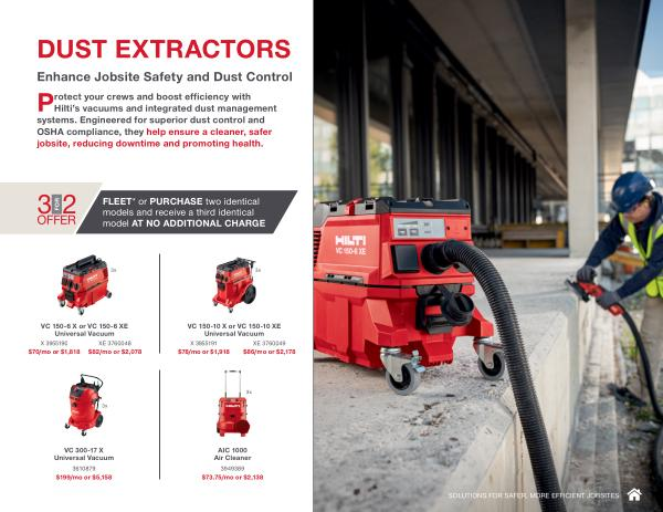 Hilti ’ s vacuums and integrated dust management systems . Engineered for superior dust control and OSHA compliance , they help ensure a cleaner , safer jobsite , reducing downtime and promoting health .