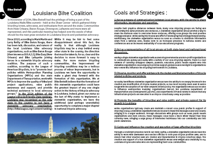 Through a consistent presence here in our state capital, a statewide organization would have the ability to work with lawmakers and elected officials to both pass bicycle positive laws, and to ensure that other enacted laws are created and implemented in bicycle-conscious ways. The creation and support of a true statewide organization would lend weight and credibility to ALL Louisiana bicycle advocates who are representing their local communities.