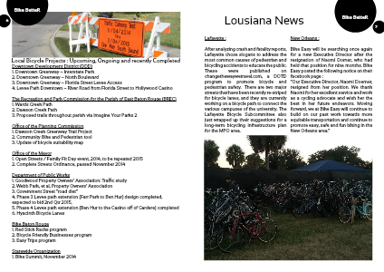 After analyzing crash and fatality reports, Lafayette chose slogans to address the most common causes of pedestrian and bicycllng accidents to educate the public. These were published on changethewaywetravel.com, a DOTD program to promote bicycle and pedestrian safety. There are two major streets that have been recently re-striped for bicycle lanes, and they are currently working on a bicycle path to connect the various campuses of the university. The Lafayette Bicycle Subcommittee also just wrapped up their suggestions for a long-term bicycling infrastructure plan for the MPO area.