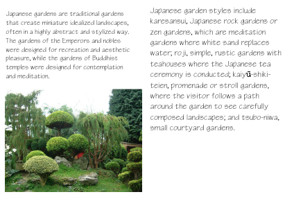Japanese garden styles include karesansui, Japanese rock gardens or zen gardens, which are meditation gardens where white sand replaces water; roji, simple, rustic gardens with teahouses where the Japanese tea ceremony is conducted; kaiyū-shiki-teien, promenade or stroll gardens, where the visitor follows a path