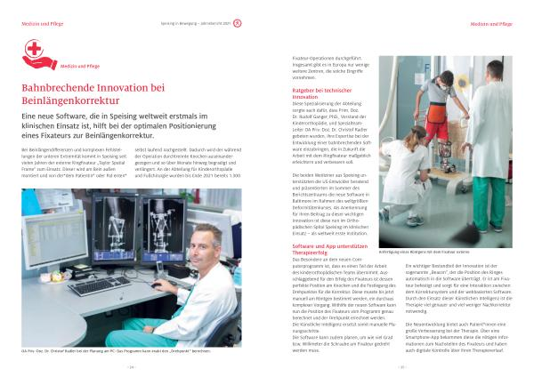 Die beiden Mediziner aus Speising unterstützten die US-Entwickler beratend und präsentierten im Sommer des Berichtszeitraums die neue Software in Baltimore im Rahmen des weltgrößten Deformitätenkurses . Als Anerkennung für ihren Beitrag zu dieser wichtigen Innovation ist diese nun im Orthopädischen Spital Speising im klinischen Einsatz – als weltweit erste Institution .