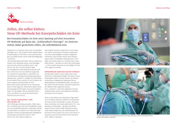 Bei Knorpelschäden im Knie setzt Speising auf eine innovative OP-Methode auf Basis der „ Schlüsselloch-Chirurgie “. Im Zentrum stehen dabei gezüchtete Zellen , die selbstklebend sind .