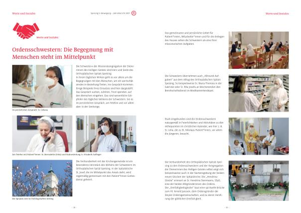 Die Schwestern der Missionskongregation der Dienerinnen des Heiligen Geistes sind Herz und Seele des Orthopädischen Spitals Speising . In ihrem täglichen Wirken geht es vor allem um die Begegnungen mit den Menschen , um ein wertschätzendes In-Beziehung-Treten , Ins-Gespräch-Kommen . Einige Beispiele ihres Einsatzes sind hier dargestellt : Das Gespräch suchen , zuhören , Trost spenden , auf den Menschen eingehen . Das sind wesentliche Eckpfeiler des täglichen Wirkens der Schwestern . Sei es im persönlichen Gespräch , am Telefon und vor allem aber in der Seelsorge .
