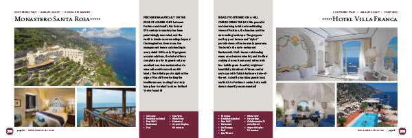 Ideally positioned on a hill overlooking the bay, this peaceful and charming hotel has breathtaking views of Positano, the beaches and the surrounding landscape. The gorgeous rooftop pool terrace and“ skybar” provide views of the heavenly panorama. The hotel’ s à la carte restaurant Restaurant Li Galli has an outstanding menu, an extensive wine list, and it offers cooking classes. Rooms and suites in its two buildings are cheerful, bright and beautifully furnished. A fitness center and a spa with Turkish baths are state-ofthe-art. A shuttle bus takes guests back and forth to Positano’ s center, but a walk down is heartily recommended!