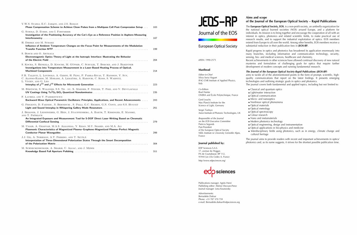The Journal of the European Optical Society-Rapid Publications( JEOS-RP) aims to tackle all of the aforementioned points in the form of prompt, scientific, highquality communications that report on the latest findings. It presents emerging technologies and outlining strategic goals in optics and photonics. The journal covers both fundamental and applied topics, including but not limited to:
