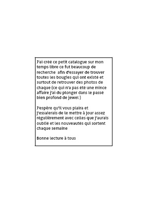 J'ai créé ce petit catalogue sur mon temps libre ce fut beaucoup de recherche afin d'essayer de trouver toutes les bougies qui ont existé et surtout de retrouver des photos de chaque (ce qui n'a pas été une mince affaire j'ai du plonger dans le passé bien profond de jewel )