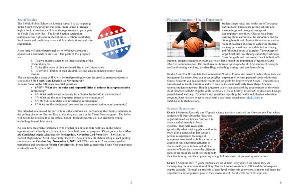 Grades 6 and 8 will complete the Connecticut Physical Fitness Assessment . While these tests can be rigorous for many , they can be an excellent opportunity to learn personal levels of physical fitness . Students can analyze their results and set goals for improvement . Grade 7 students have transitioned to health education and will receive instruction directly from Shape America national student outcomes . Health education is a critical aspect of the development of the whole child . Students will develop the skills necessary to make healthy , informed life decisions through project-based learning . If you have any questions regarding the health and physical education program , don ' t hesitate to get in touch with department coordinator
