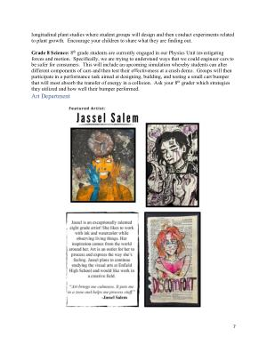 Grade 8 Science : 8 th grade students are currently engaged in our Physics Unit investigating forces and motion . Specifically , we are trying to understand ways that we could engineer cars to be safer for consumers . This will include an upcoming simulation whereby students can alter different components of cars and then test their effectiveness at a crash demo . Groups will then participate in a performance task aimed at designing , building , and testing a small cart bumper that will most absorb the transfer of energy in a collision . Ask your 8 th grader which strategies they utilized and how well their bumper performed .