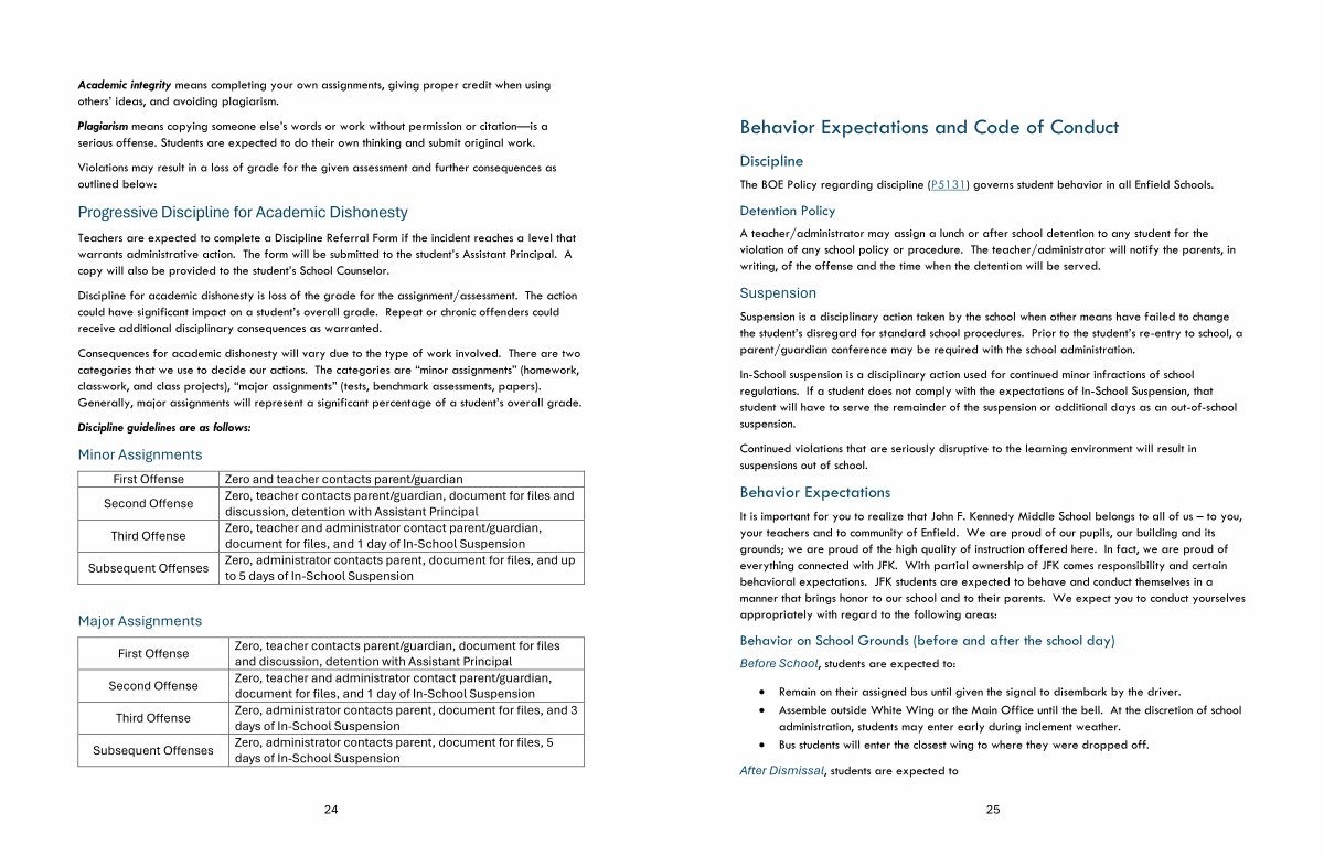 It is important for you to realize that John F. Kennedy Middle School belongs to all of us – to you, your teachers and to community of Enfield. We are proud of our pupils, our building and its grounds; we are proud of the high quality of instruction offered here. In fact, we are proud of everything connected with JFK. With partial ownership of JFK comes responsibility and certain behavioral expectations. JFK students are expected to behave and conduct themselves in a manner that brings honor to our school and to their parents. We expect you to conduct yourselves appropriately with regard to the following areas: