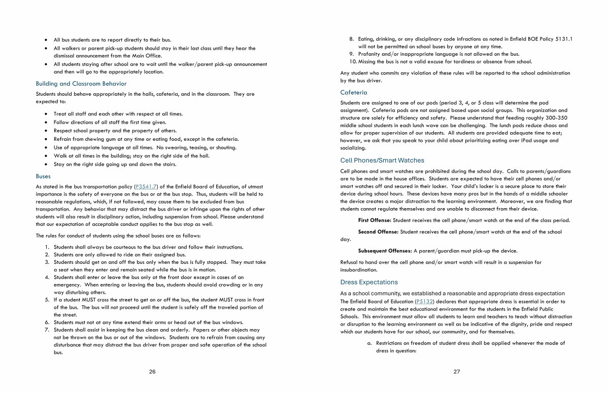 8. Eating, drinking, or any disciplinary code infractions as noted in Enfield BOE Policy 5131.1 will not be permitted on school buses by anyone at any time. 9. Profanity and / or inappropriate language is not allowed on the bus. 10. Missing the bus is not a valid excuse for tardiness or absence from school.