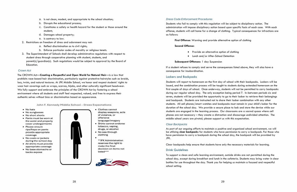 As part of our ongoing efforts to maintain a positive and organized school environment, we will be utilizing clear backpacks for students who have permission to carry a backpack. For those who have permission to carry a backpack during the school day, the backpack will be provided by JFK.