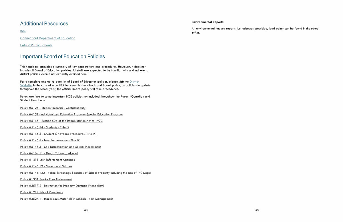 This handbook provides a summary of key expectations and procedures. However, it does not include all Board of Education policies. All staff are expected to be familiar with and adhere to district policies, even if not explicitly outlined here.