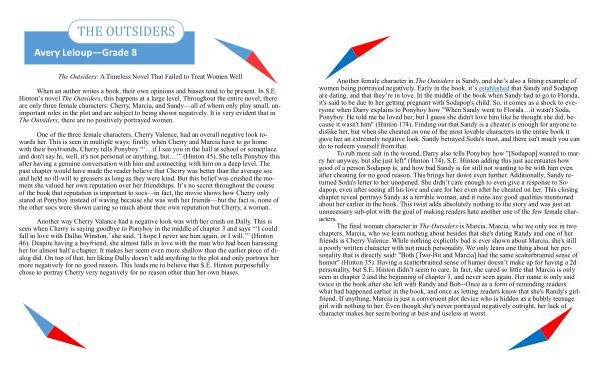 The final woman character in The Outsiders is Marcia . Marcia , who we only see in two chapters . Marcia , who we learn nothing about besides that she ' s dating Randy and one of her friends is Cherry Valence . While nothing explicitly bad is ever shown about Marcia , she ' s still a poorly written character with not much personality . We only learn one thing about her personality that is directly said : " Both [ Two-Bit and Marcia ] had the same scatterbrained sense of humor " ( Hinton 35 ). Having a scatterbrained sense of humor doesn ’ t make up for having a 2d personality , but S . E . Hinton didn ’ t seem to care . In fact , she cared so little that Marcia is only seen in chapter 2 and the beginning of chapter 3 , and never seen again . Her name is only said twice in the book after she left with Randy and Bob--Once as a form of reminding readers what had happened earlier in the book , and once as letting readers know that she ' s Randy ' s girlfriend . If anything , Marcia is just a convenient plot device who is hidden as a bubbly teenage girl with nothing to her . Even though she ' s never portrayed negatively outright , her lack of character makes her seem boring at best and useless at worst .
